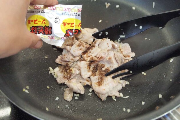 生姜、にんにくのみじん切りも加えて炒め合わせます。そこに粉末ソースを1袋の1/3だけ入れ、お肉に味をつけて下さい。