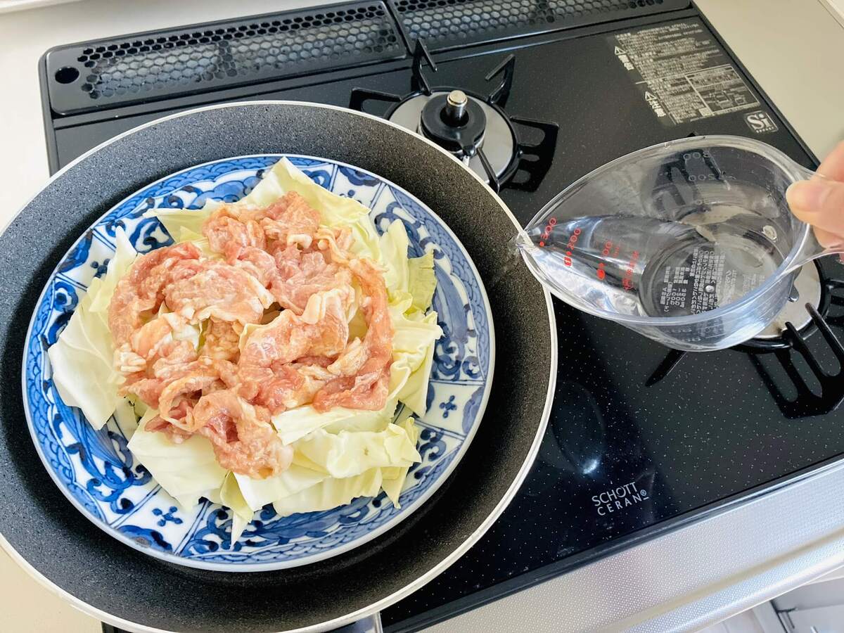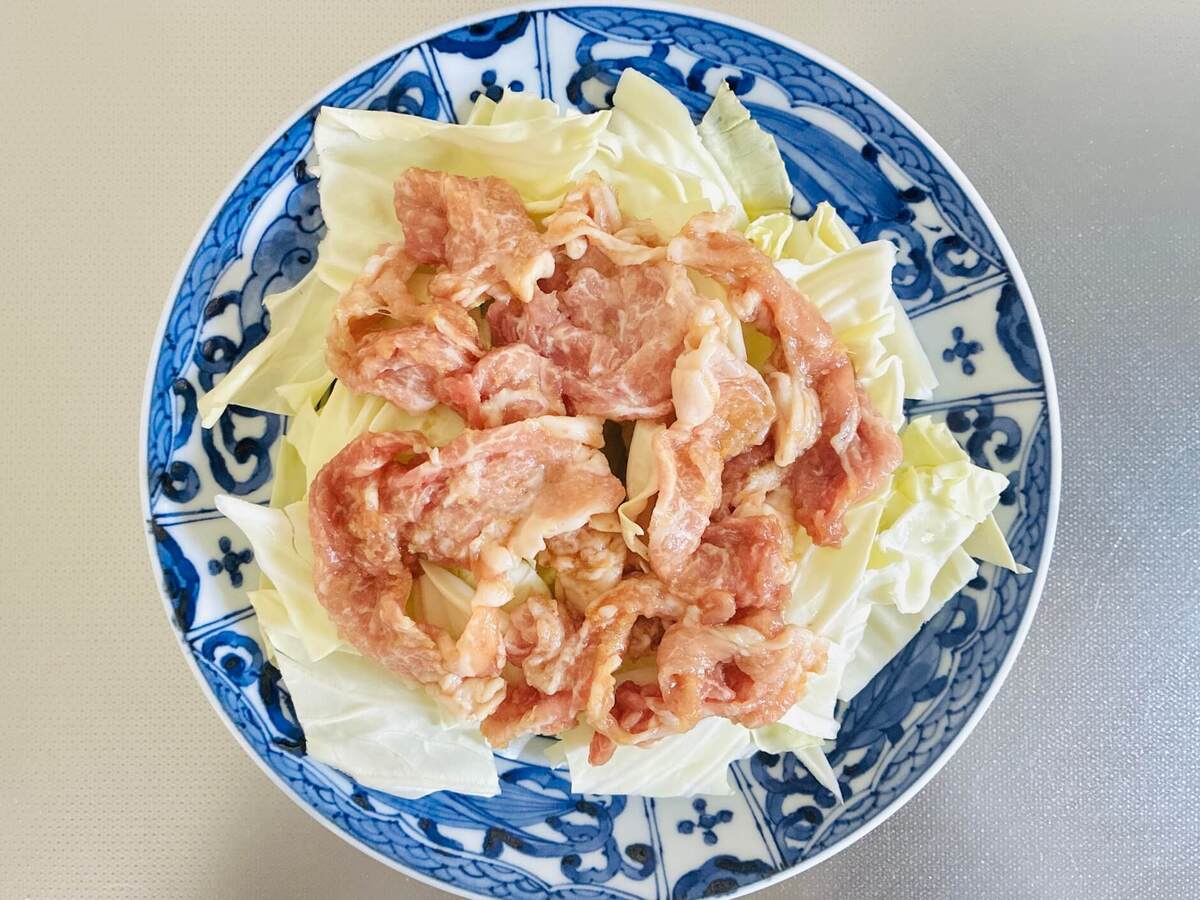 その上に、キャベツと豚こま肉をのせた耐熱皿をのせます。