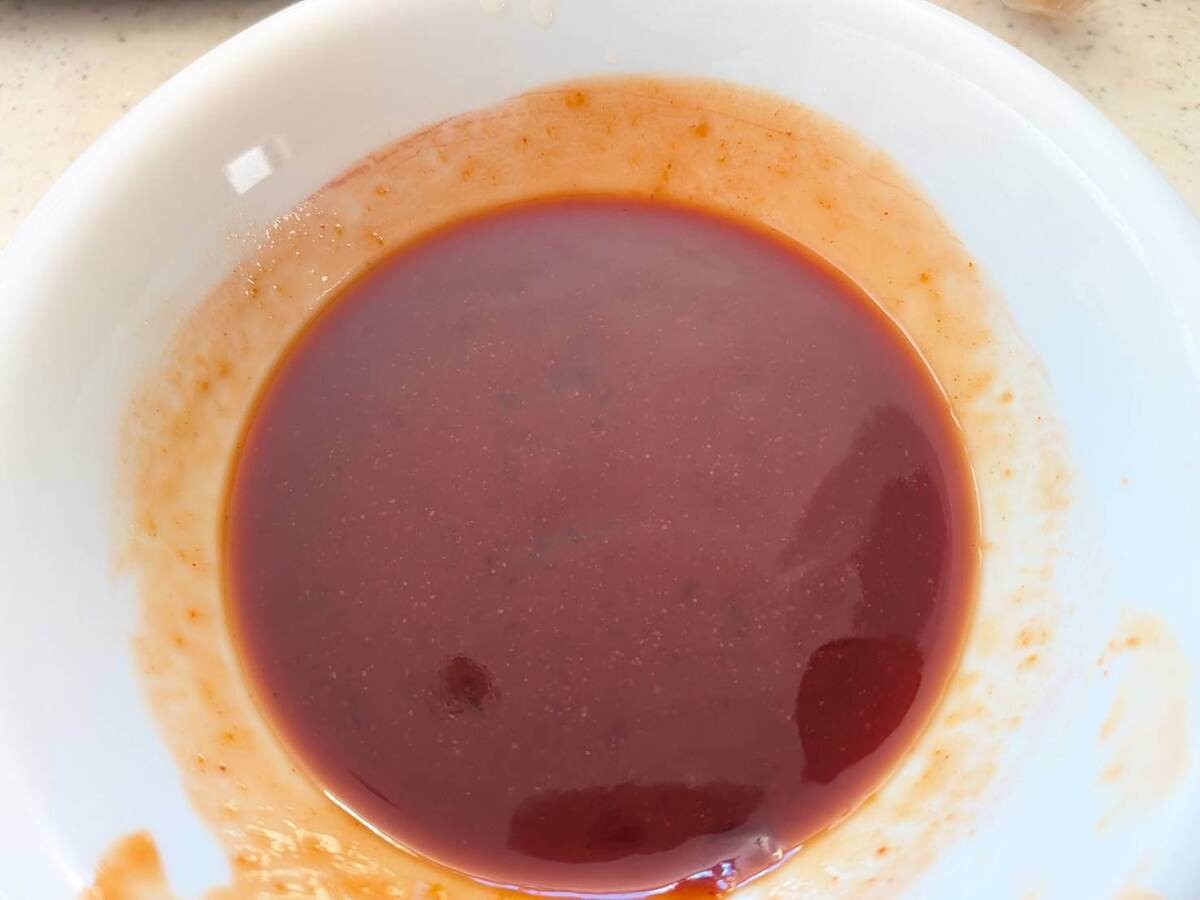 この時、コチュジャン、砂糖、ケチャップを先に入れて酒を後から少しずつ入れてのばすようにすると、ダマになりにくく混ぜやすいですよ。