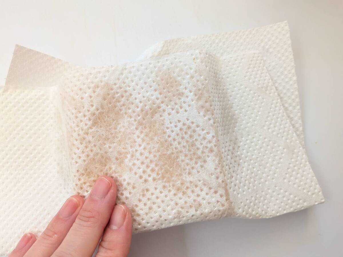 厚揚げはペーパータオルで余分な油を拭き取ります。