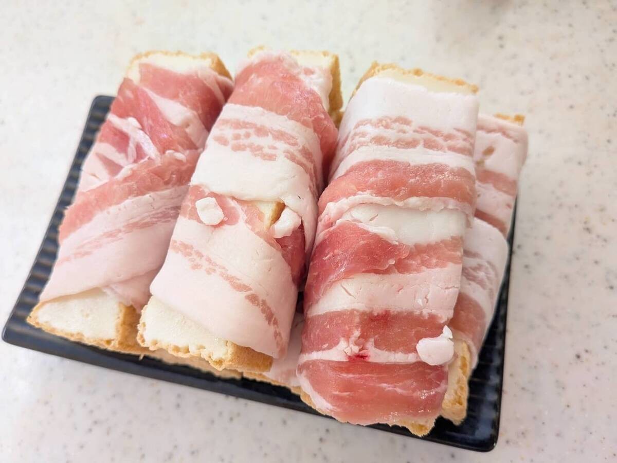 ①の厚揚げに、豚バラ肉を巻き付けます。
