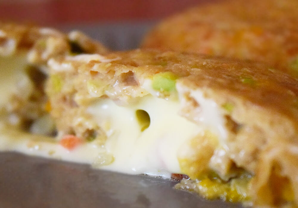 中には、とろりと溶けたチーズがたっぷり入っています。豆腐ハンバーグ自体は柔らかく軽やかですが、濃厚なチーズが加わることで、味わいに奥行きが生まれます。ご飯が進む一品です。
