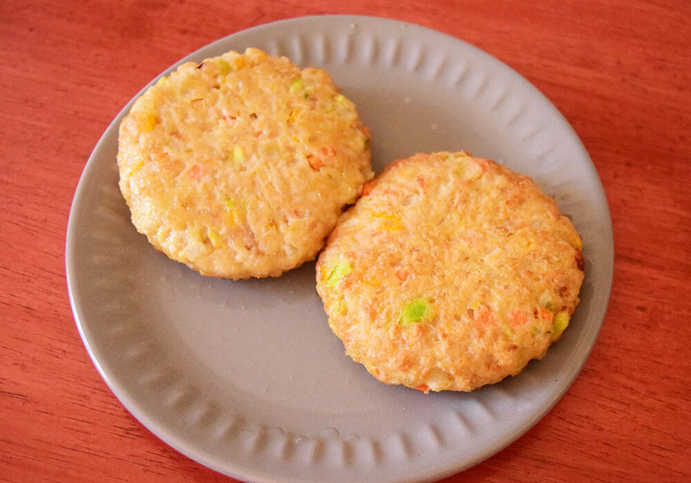 電子レンジで温めてみました。ハンバーグの表面にはコーンやニンジンなどの具材が見え隠れしており、ヘルシーな印象です。一般的なハンバーグと比べるとやや柔らかめなので、お皿に移す際は形が崩れないよう注意したほうがよさそうです。