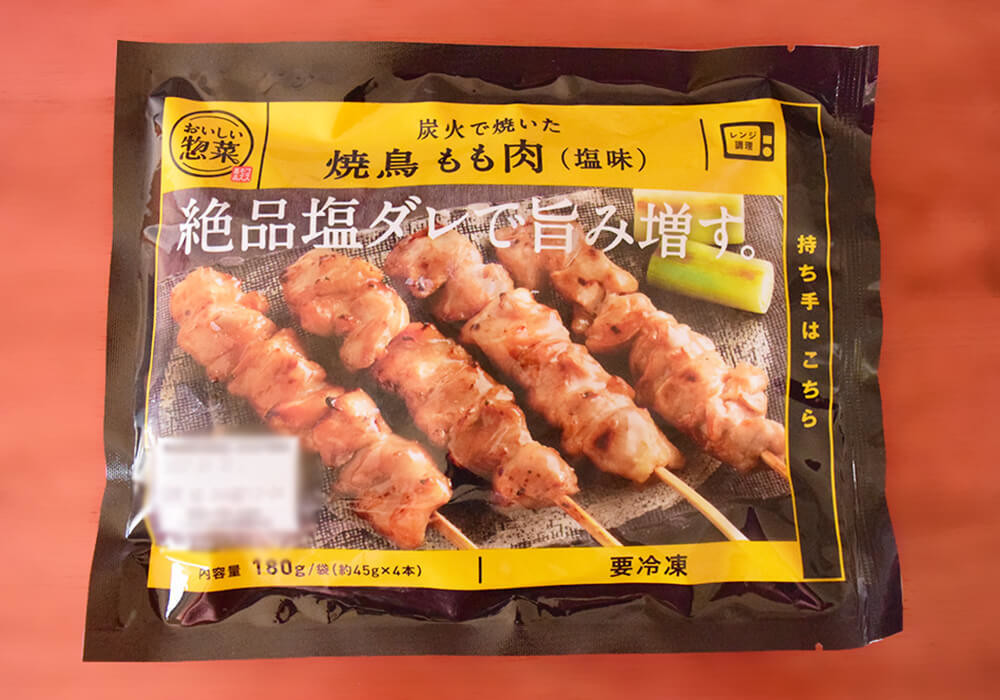 コスモス薬局のプライベートブランド商品「焼鳥 もも肉(塩味)」。1袋4本入りです。外袋には「持ち手はこちら」という表記があり、こうした細かな配慮が地味にうれしいポイント。こちらも電子レンジ調理に対応しています。