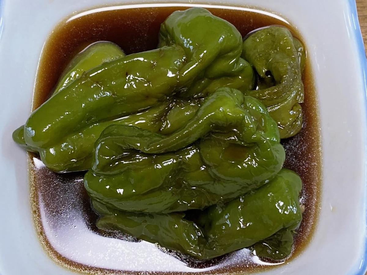 煮びたしと言えばナスみたいな固定観念があったけどピーマンも問題なくジュワジュワの照り照りの美味しそうな仕上がりです。