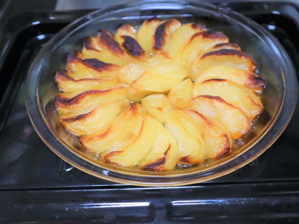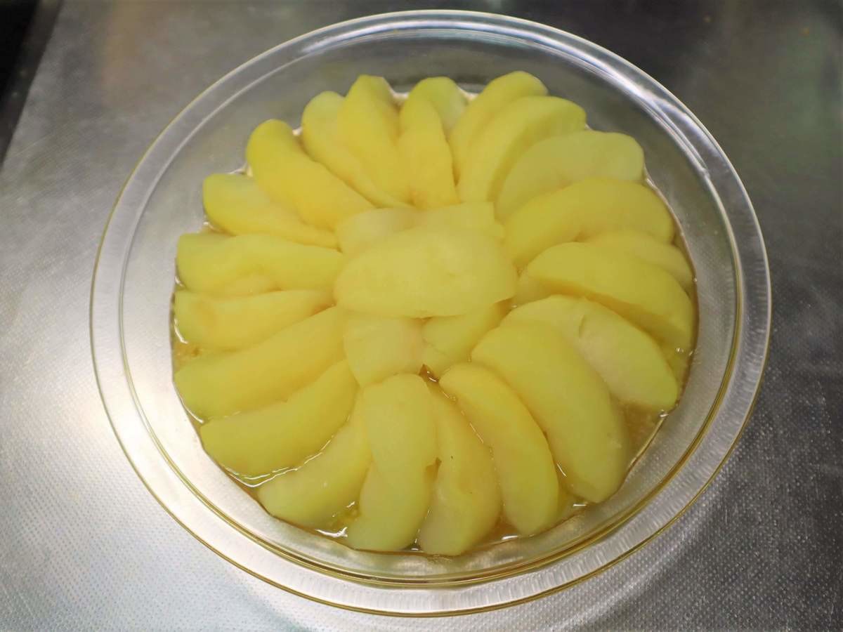 その上に加熱したリンゴを耐熱皿の形に合わせてしきつめます。オーブンで200℃・60分ほど焼きます。