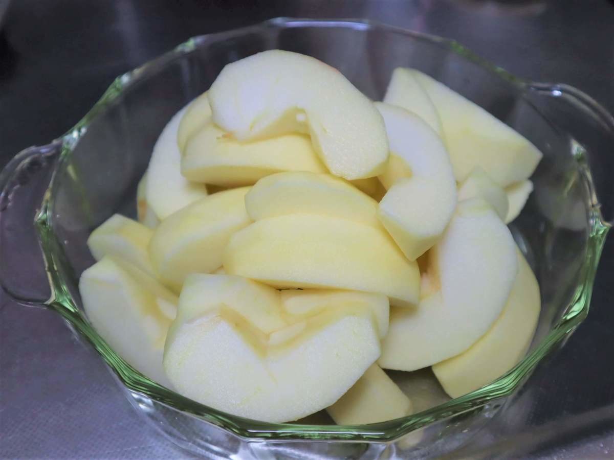 リンゴの皮をむき、8等分にカットしてラップをかけてレンジで10分ほど加熱します。