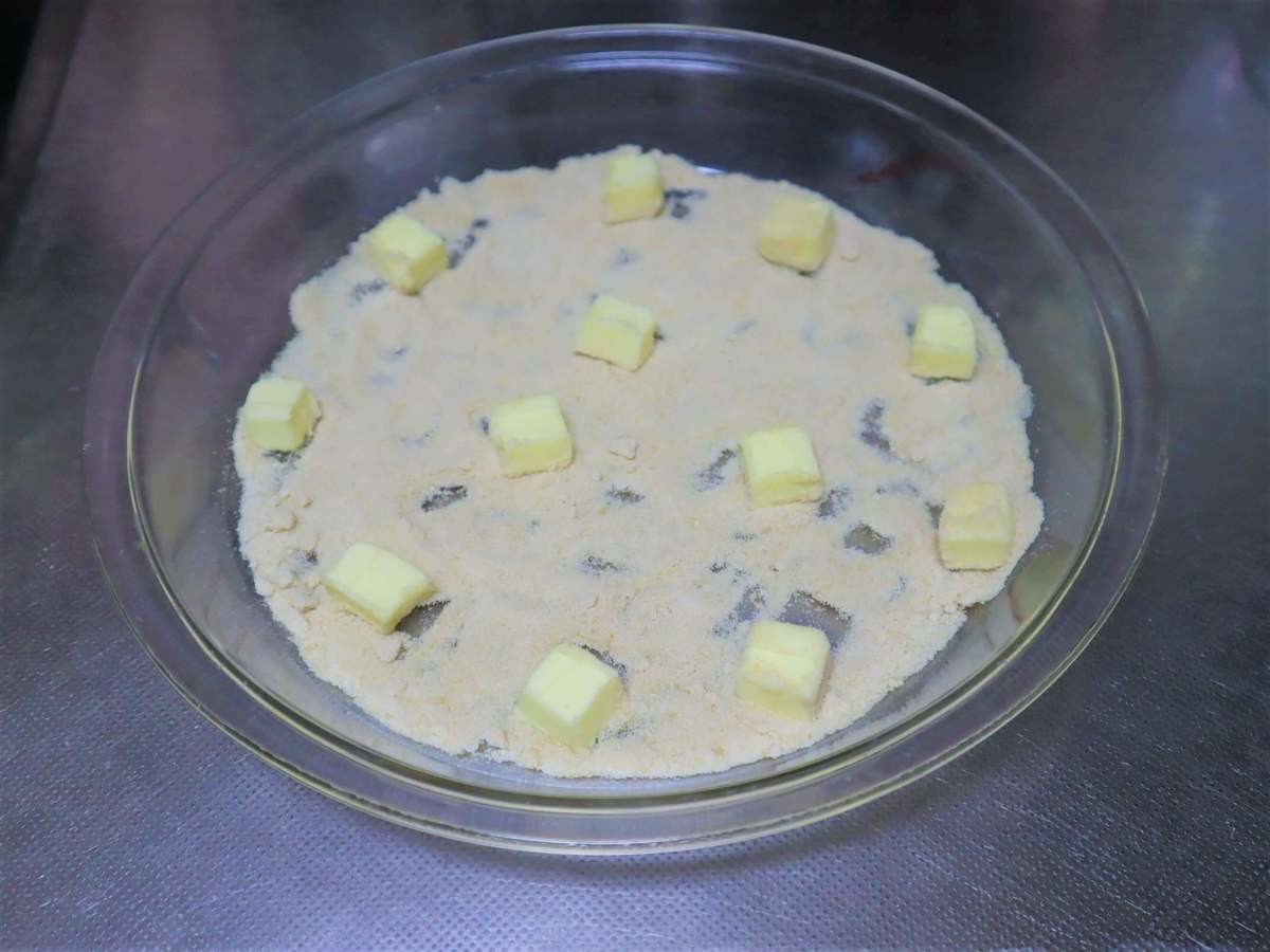 耐熱皿に砂糖100gを全体的にまぶし、バター25gを手でちぎって散らします。
