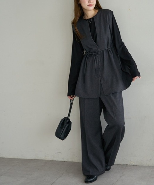 これさえあればコーデに悩まない、頼れる3点セット。きちんと感漂うVネックジレはペプラムシルエットになっていて、気になる腰まわりをさりげなくカバー&ウエスト位置も自然と高く見せてくれます。パンツは楽ちん後ろゴム仕様なのにきれい見え。別々でも重宝するから、着こなしの幅もアップ。