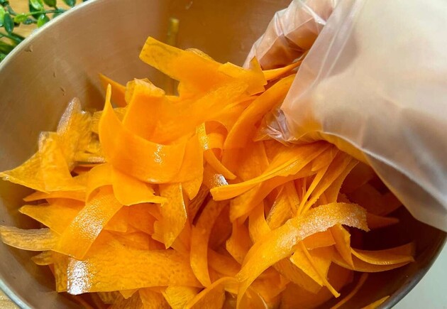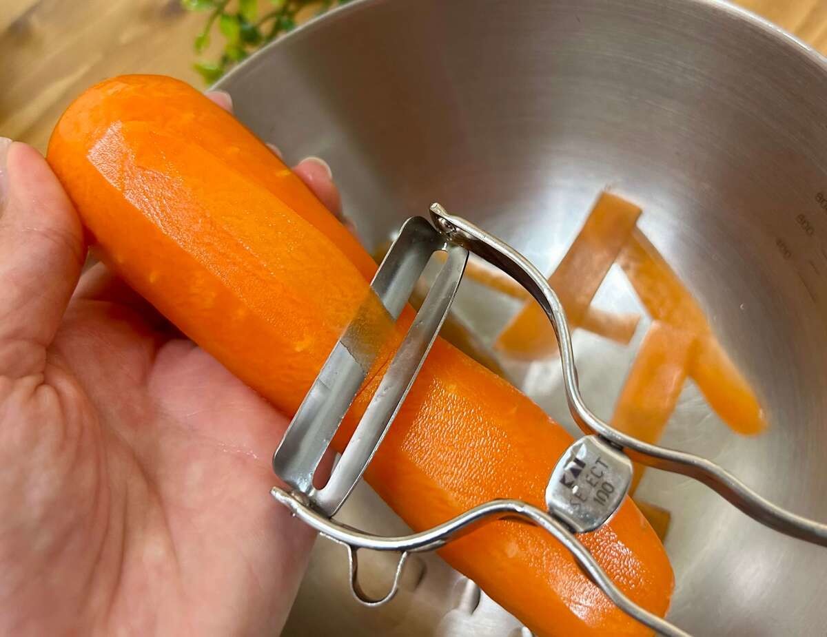 にんじんは皮をむいて、ピーラーで薄く削ります。
