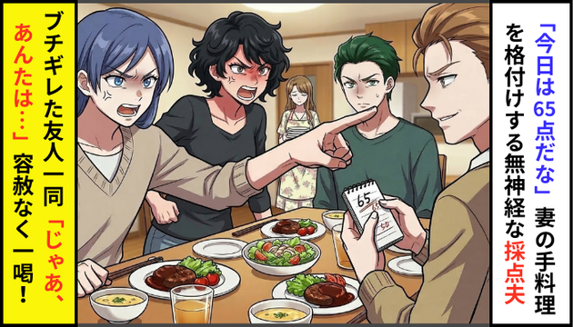 「今日は65点だな」新妻の手料理を格付けする無神経な“採点夫”。「ハァァ?じゃあ、あんたは…」友人が容赦なく一喝!