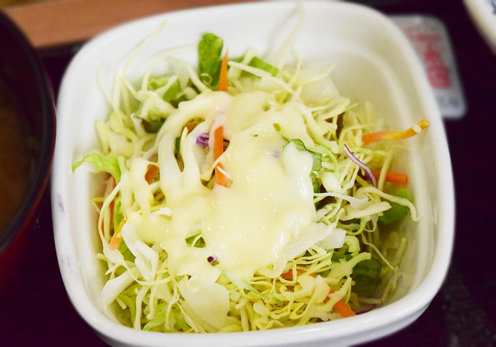 サラダの横には「マヨネーズタイプ半固体状ドレッシング」が付いてきます。そのまま生野菜を食べるのはちょっと……という場合は、つけて食べるのもアリです。
