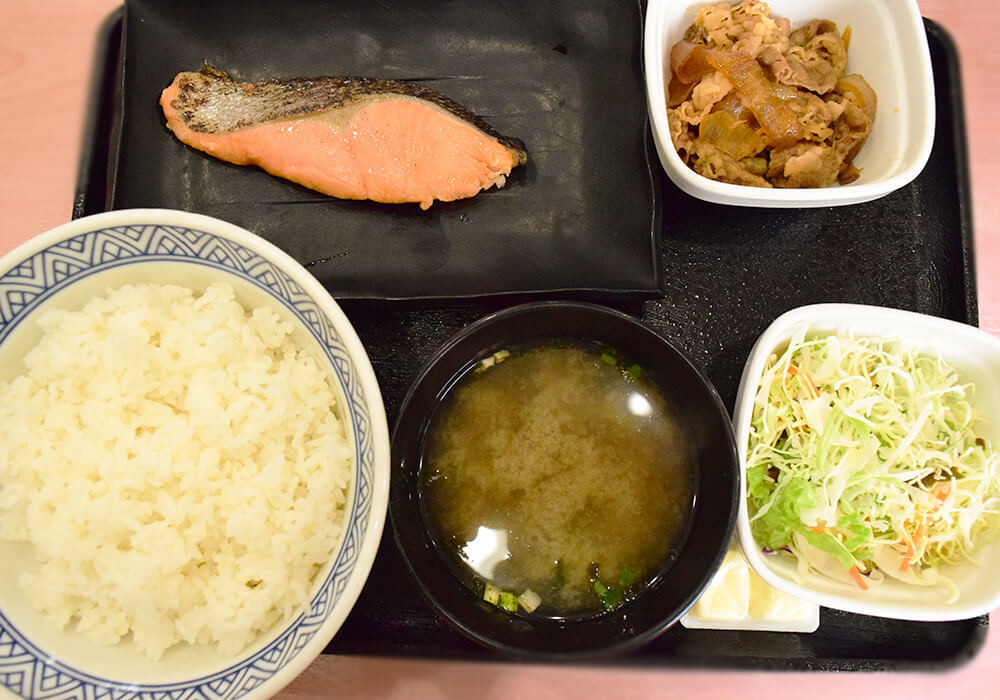 前述の「ハムエッグ牛小鉢定食」がハムエッグをメインにしているのに対し、こちらはメインが鮭になっていますね。それ以外の内容は同じ。なお、お持ち帰りは不可。
