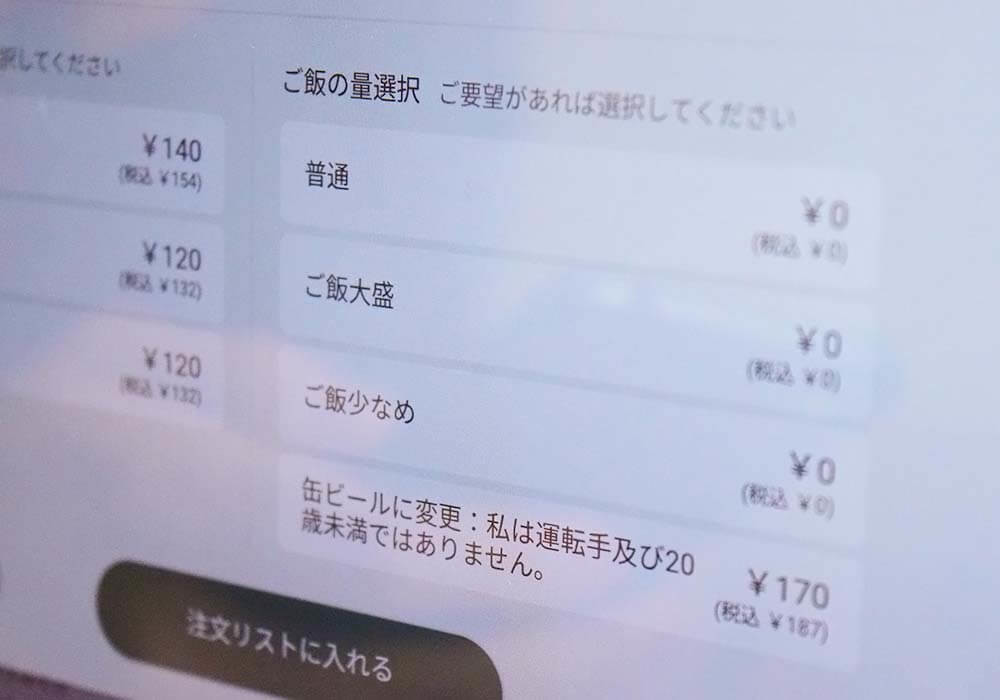 ごはんの増量は、注文時に卓上のタブレット端末から設定できます。余談ですが、プラス187円でドリンクを缶ビールに変更することも可能なようです。