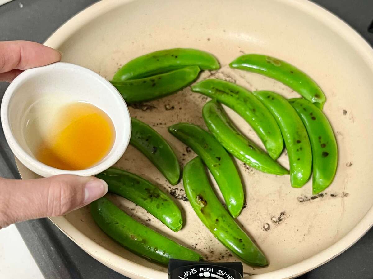 スナップえんどうをフライパンの端に寄せ、空いたスペースに醤油を注ぎます。