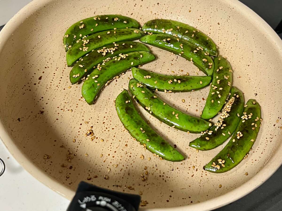 スナップえんどうの焼き色、そして全体に絡んだ焦がし醤油と白ごまがとっても美味しそうです。