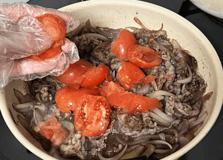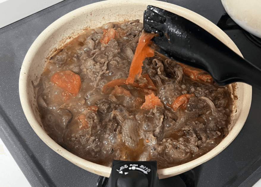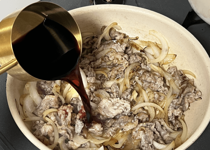 玉ねぎが色づいたら牛バラ肉を加え、さらに炒めて焼き色をつけましょう。