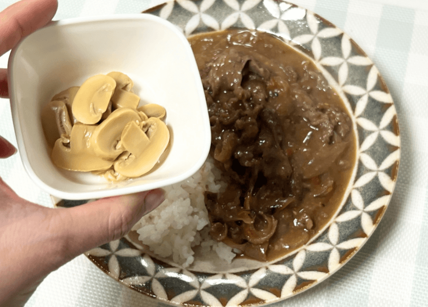 今回は缶で売られている水煮マッシュルームを使用しましたが、仕上げのマッシュルームがあるだけでパッと華やかになり、おうちごはんなのにまるで外食のような気分が味わえます♪