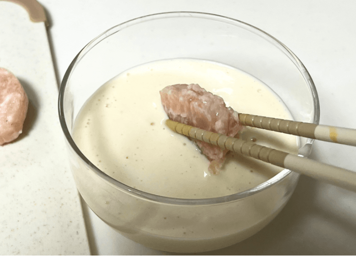 このバッター液にくぐらせる工程が、マクドナルド風チキンナゲットに近づける大事なポイント。