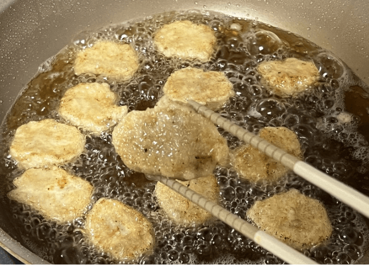 タネをバッター液にさっとくぐらせたら、160℃の油で3分ほど揚げましょう。