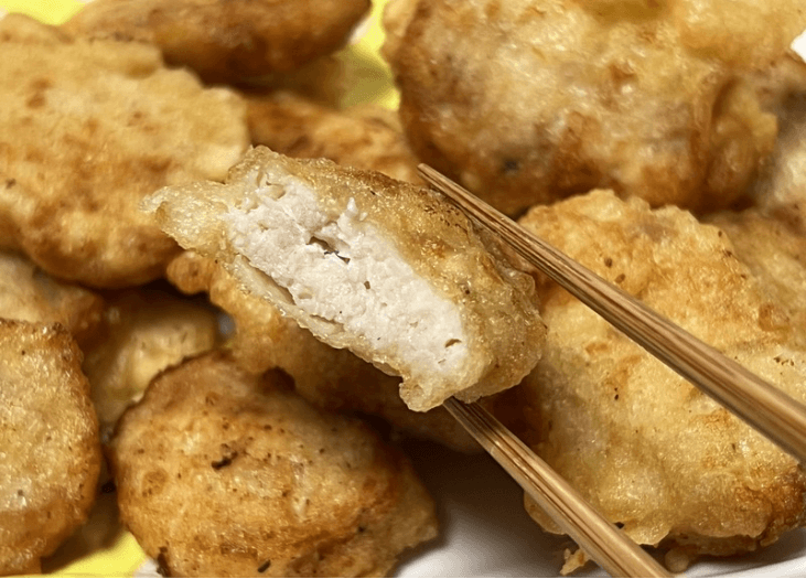豆腐を入れているおかげか、チキンナゲット特有のふわふわとしたやわらかさがあり、あえて形を残した鶏むね肉の食べごたえもしっかり感じられます。
