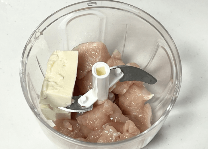 切った鶏むね肉と、豆腐をフードプロセッサーにかけます。