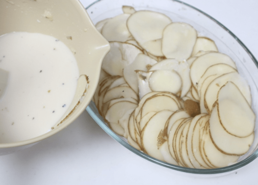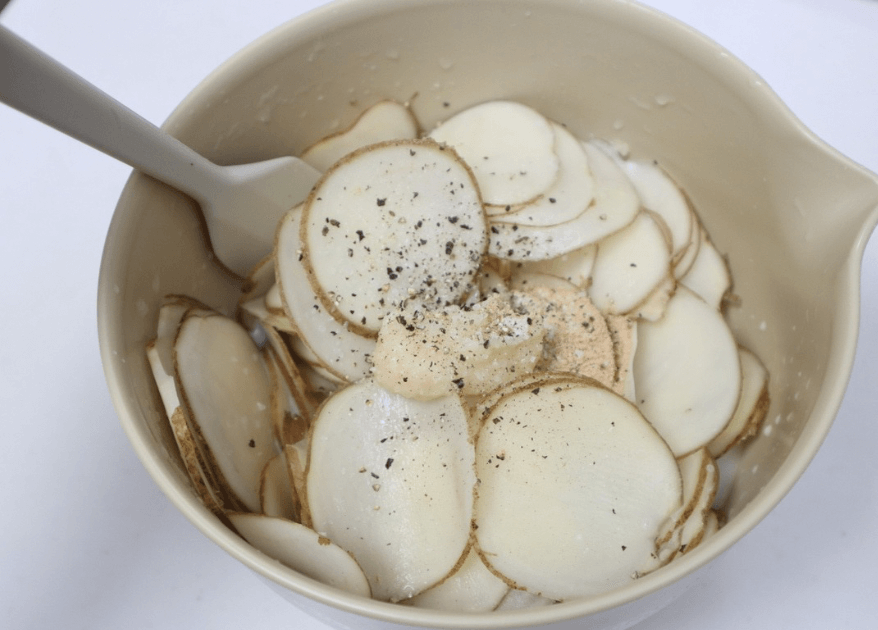 次に、耐熱容器にスライスしたじゃがいもを並べて入れ、ボウルに残った調味料もじゃがいもにかけます。