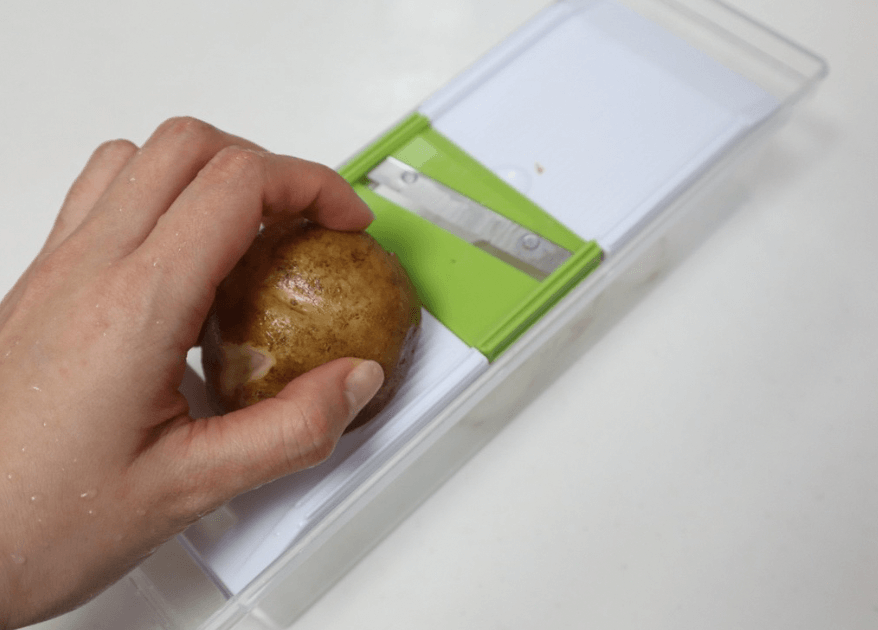 じゃがいもはよく洗って、皮ごとスライサーで薄切りにします。