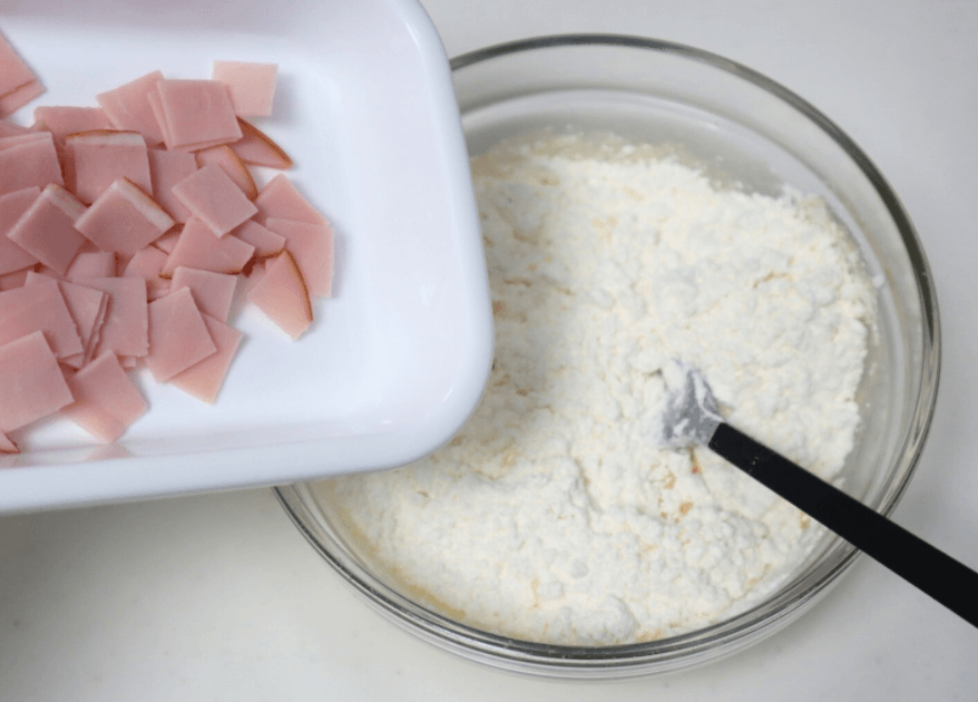続いて、ホットケーキミックスと先ほどのハムを加えてさっくり混ぜ合わせましょう♪