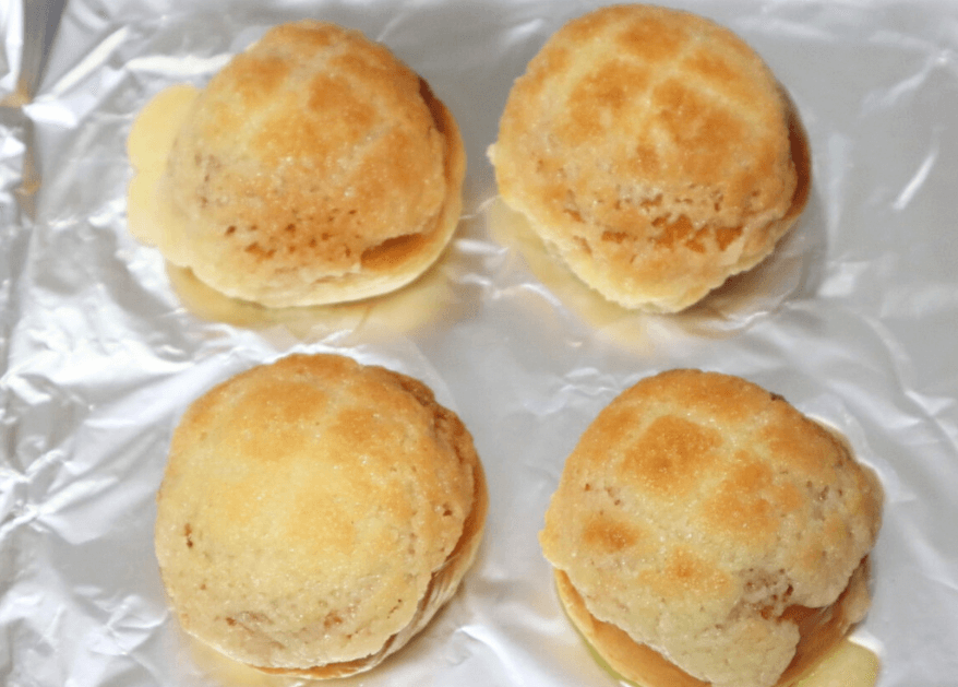 なんとこのクリームパンに、クッキー生地をのせて焼き、メロンパン風に魔改造してしまう禁断のレシピなんです(笑)。
