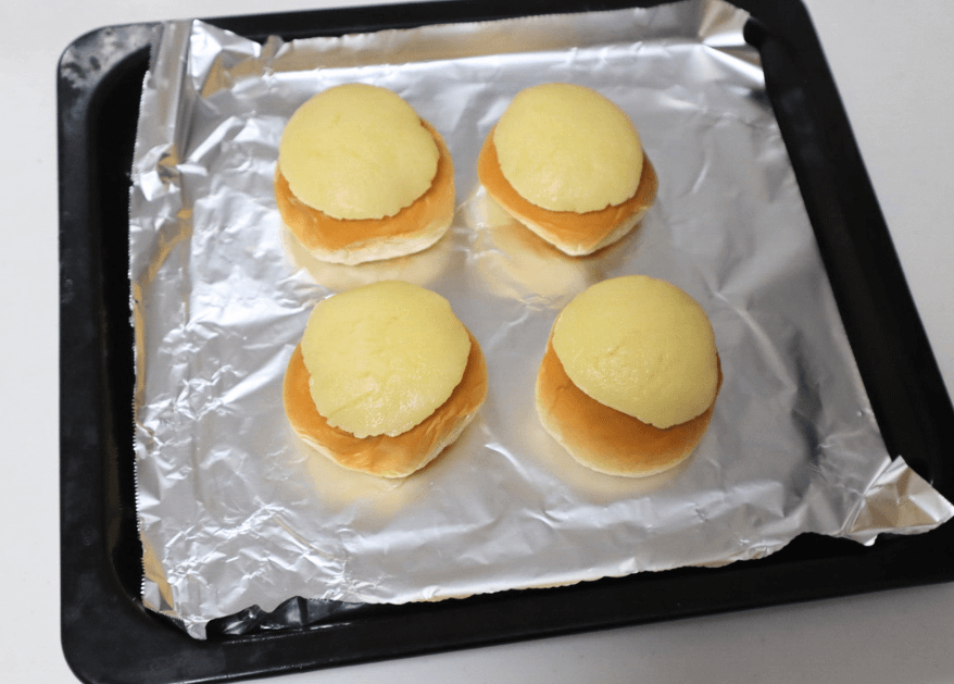生地を4等分して丸めたら、手のひらで軽く潰し、クリームパンの上にぺたっとのせましょう。