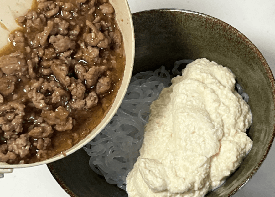 豆腐ソース・豚ひき肉をよ〜く混ぜて食べると、すべての食材がしらたきに絡んで美味しさが倍増するので、大胆に混ぜて食べるのが断然おすすめです。