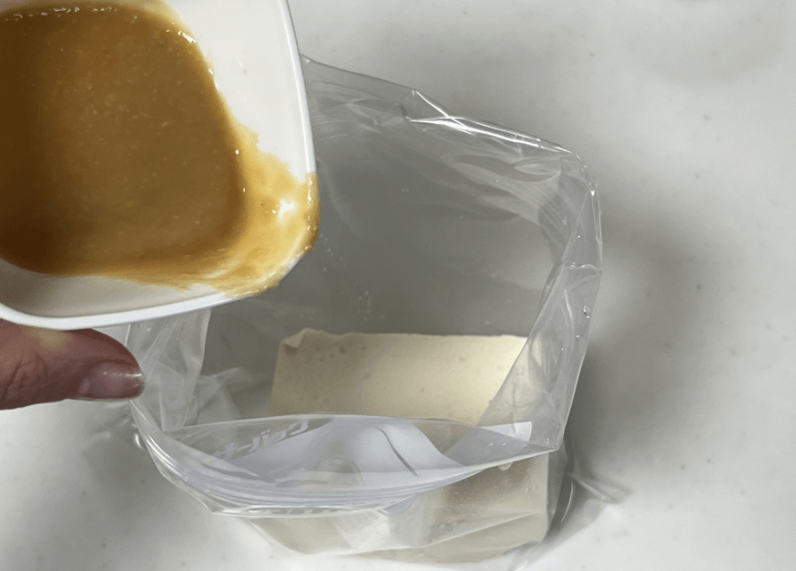 ポリ袋に絹豆腐と味噌を入れて、なめらかになるまで袋の上から混ぜます。