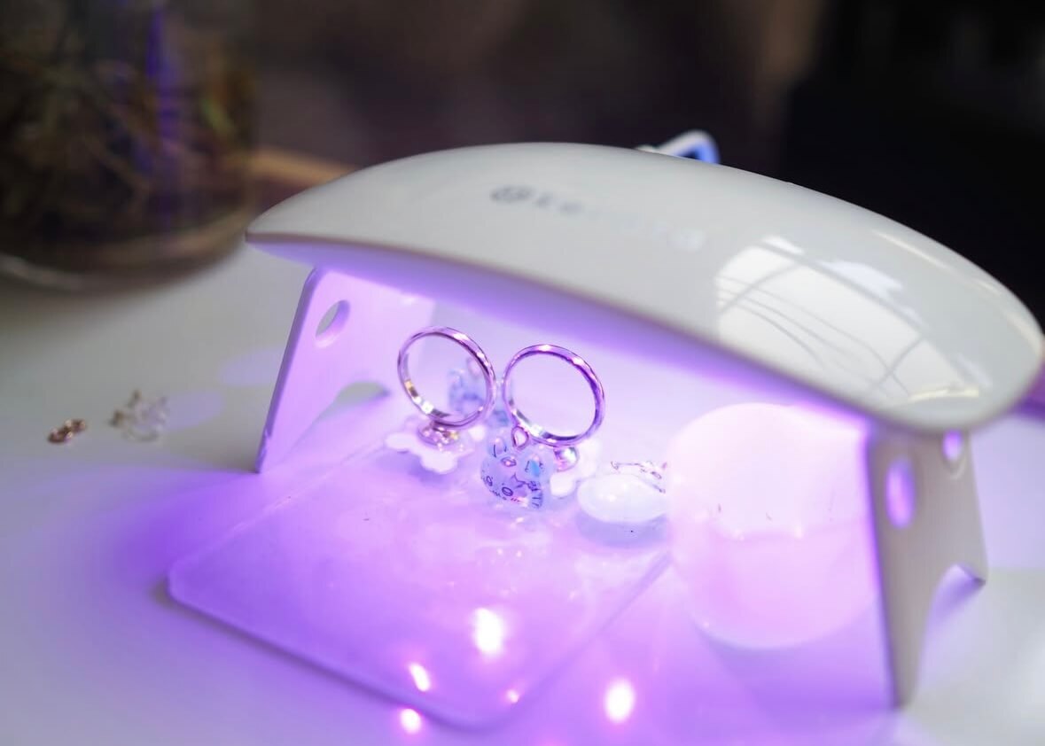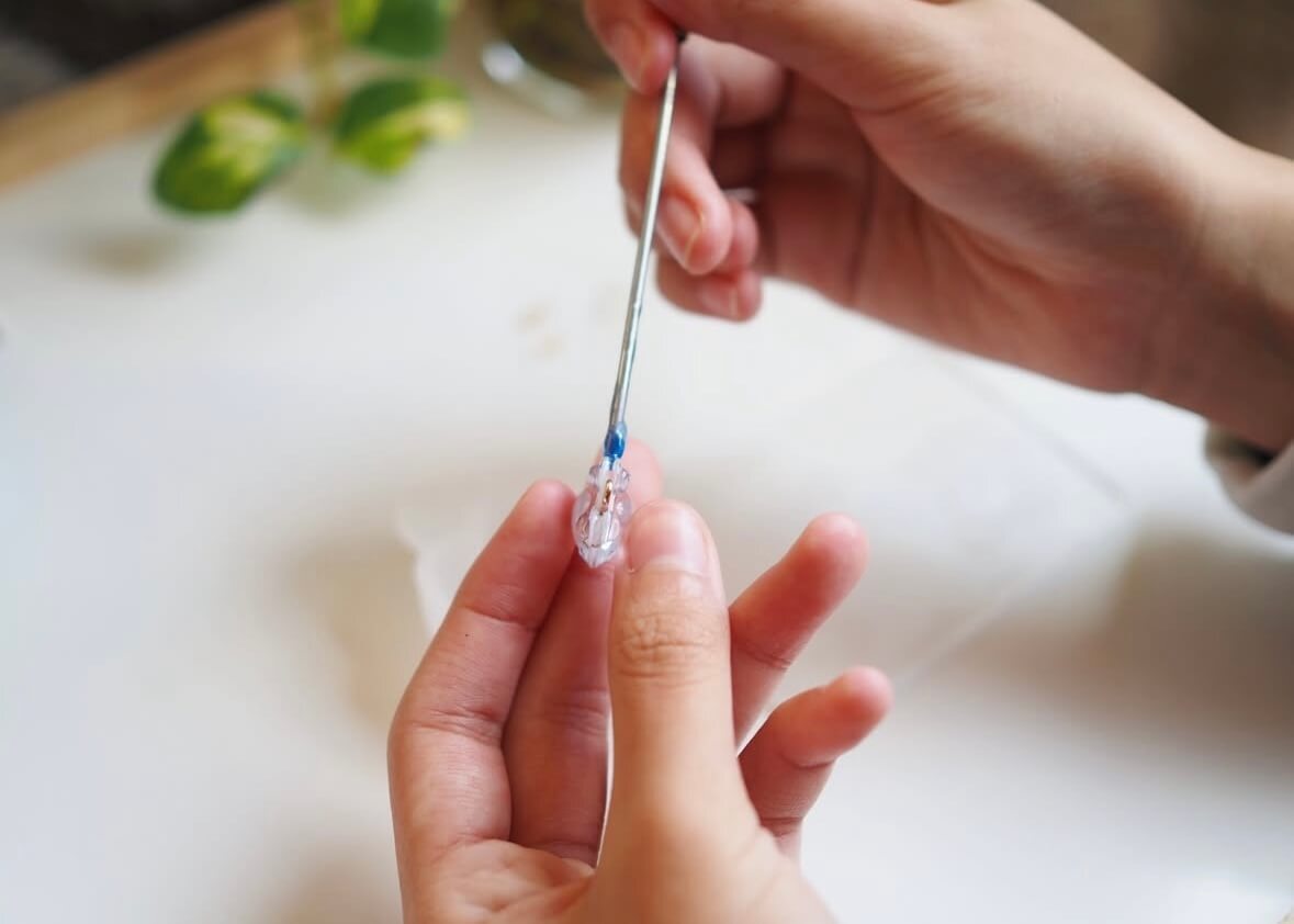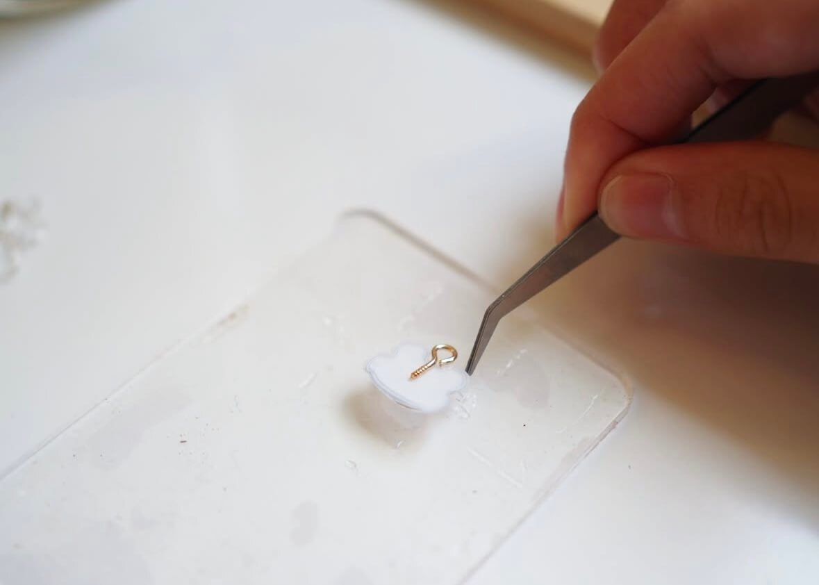 シールとアクセサリーパーツのつなぎ目にレジン液を塗ってから、レジンランプで数分硬化させるだけでOKです♪