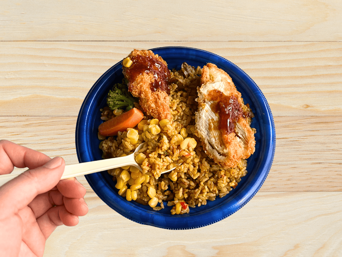 蓋を開けると、付け合わせのブロッコリーにんじんコーンが鮮やかでウキウキします。