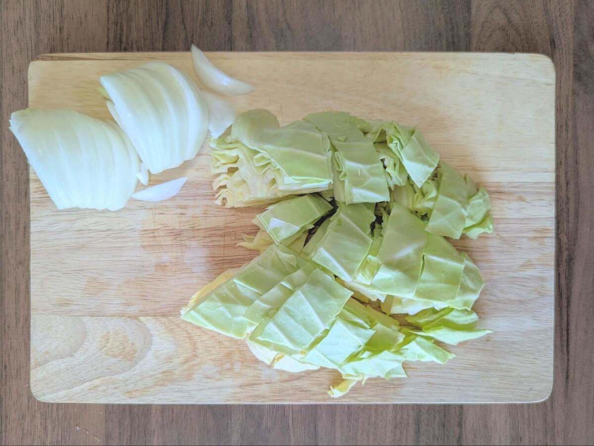 キャベツは1.5cmほどのざく切りにし、玉ねぎは1cmのくし形にカットします。