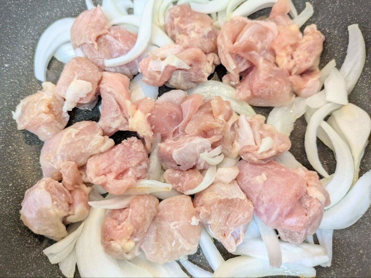 皮目を下にした鶏もも肉と玉ねぎを並べ、強めの中火で焼き色がつくまで焼きます。