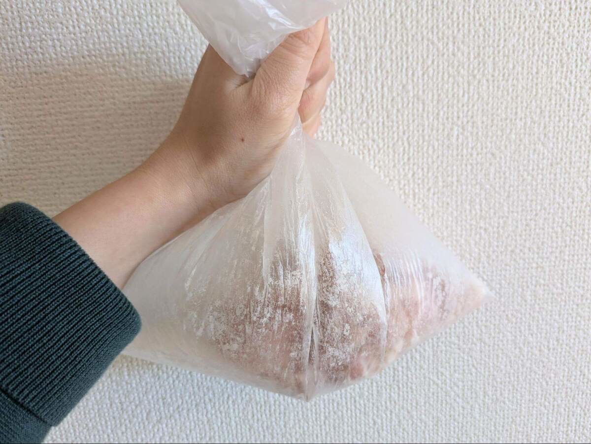 鶏もも肉が入った袋に片栗粉を入れ、振り振りシェイクシェイク!