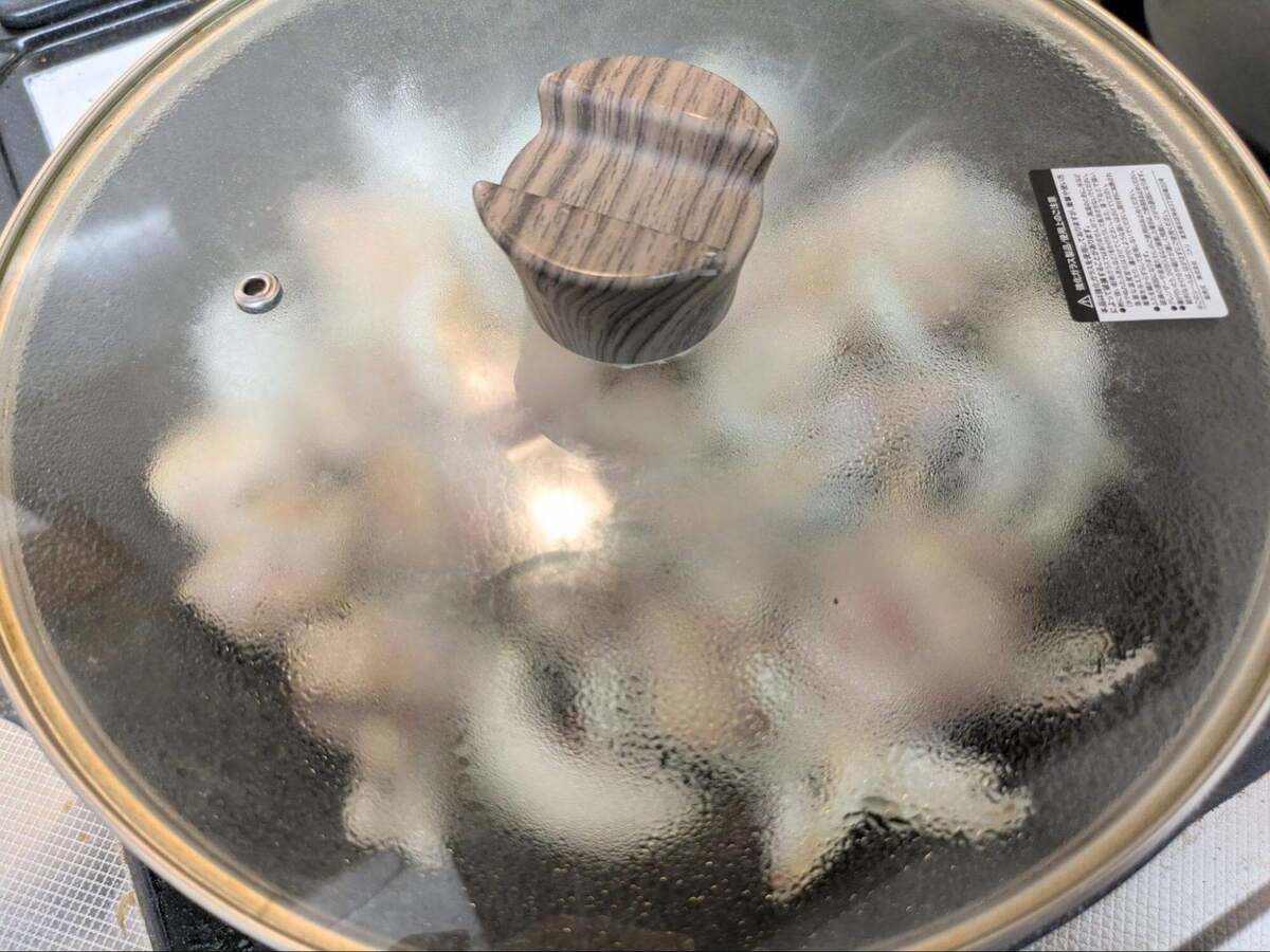 焼き色がついたら裏返してフタをし、弱火で3~4分ほど蒸し焼きにしてお肉の中まで火を通します。