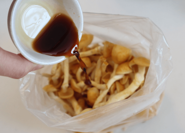 なめこをポリ袋に全て入れたら、めんつゆを加えて外側から揉み込んで馴染ませます。