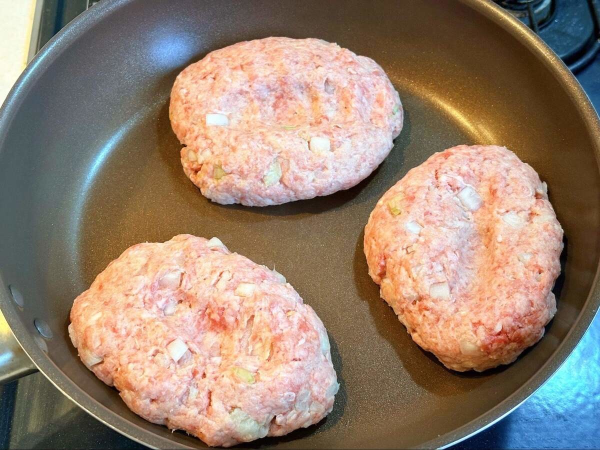 ひき肉から自然に脂が出てくるので、フライパンには油をひかず、そのまま中火で焼き始めます。
