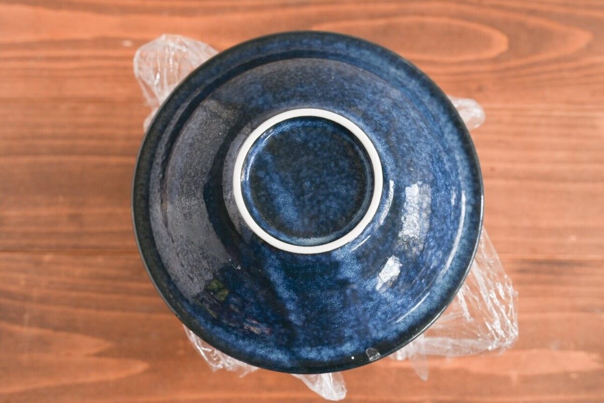 どんぶりの上に皿をのせて上下を返します。
