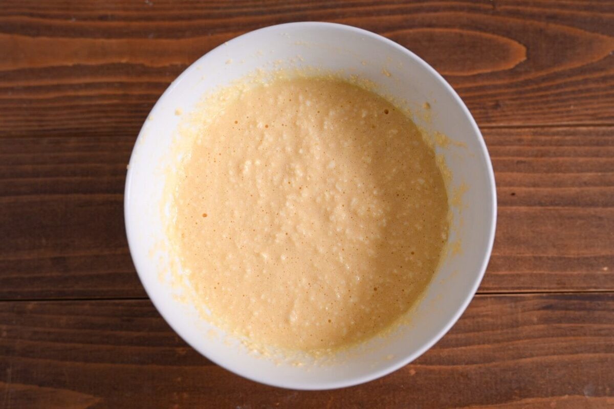 そこに卵を割り入れ、泡立て器で滑らかになるまで混ぜましょう。