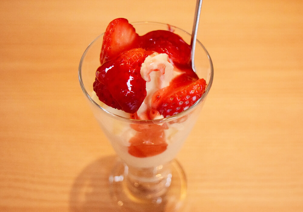 ソフトクリームの上にカットいちごといちごソースをあしらったミニパフェで、食後にちょうど良いサイズ感です。