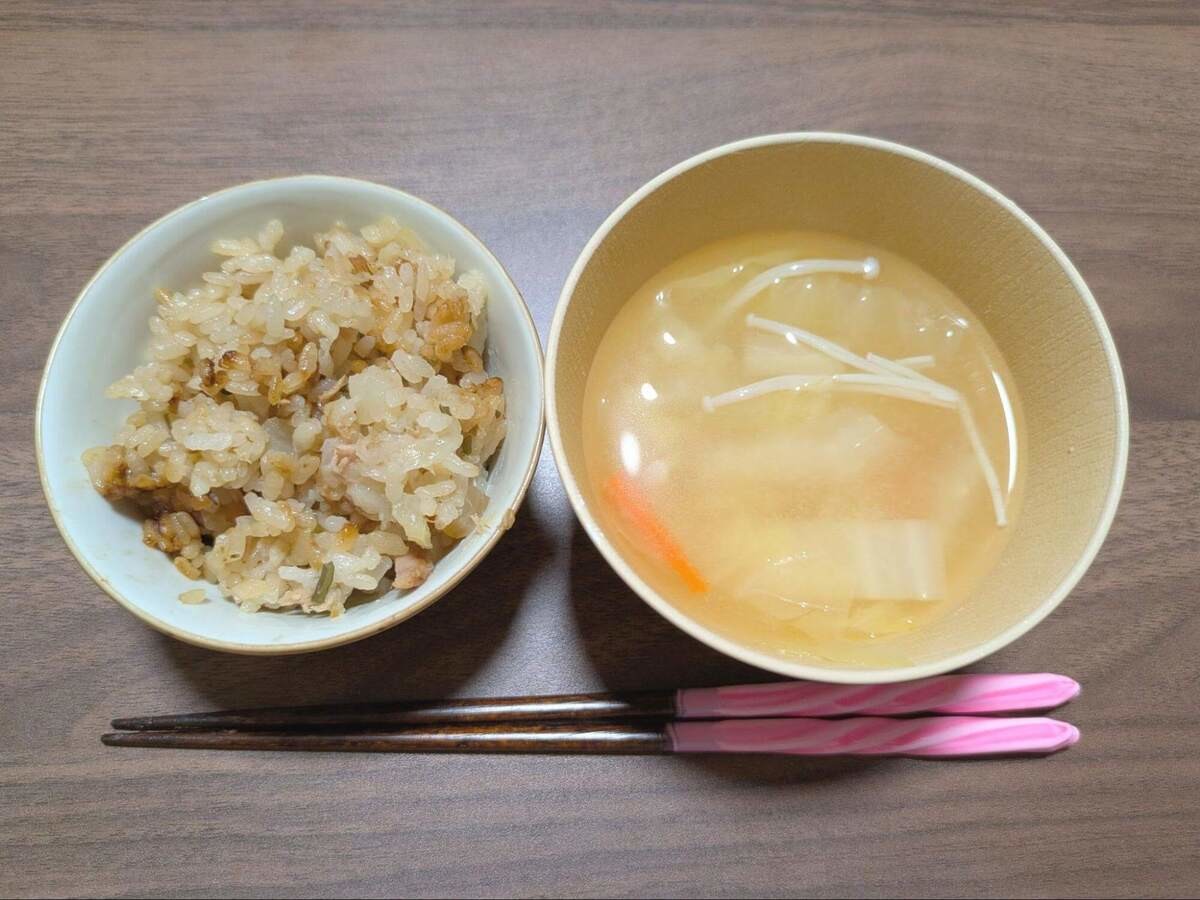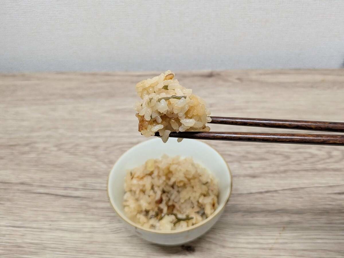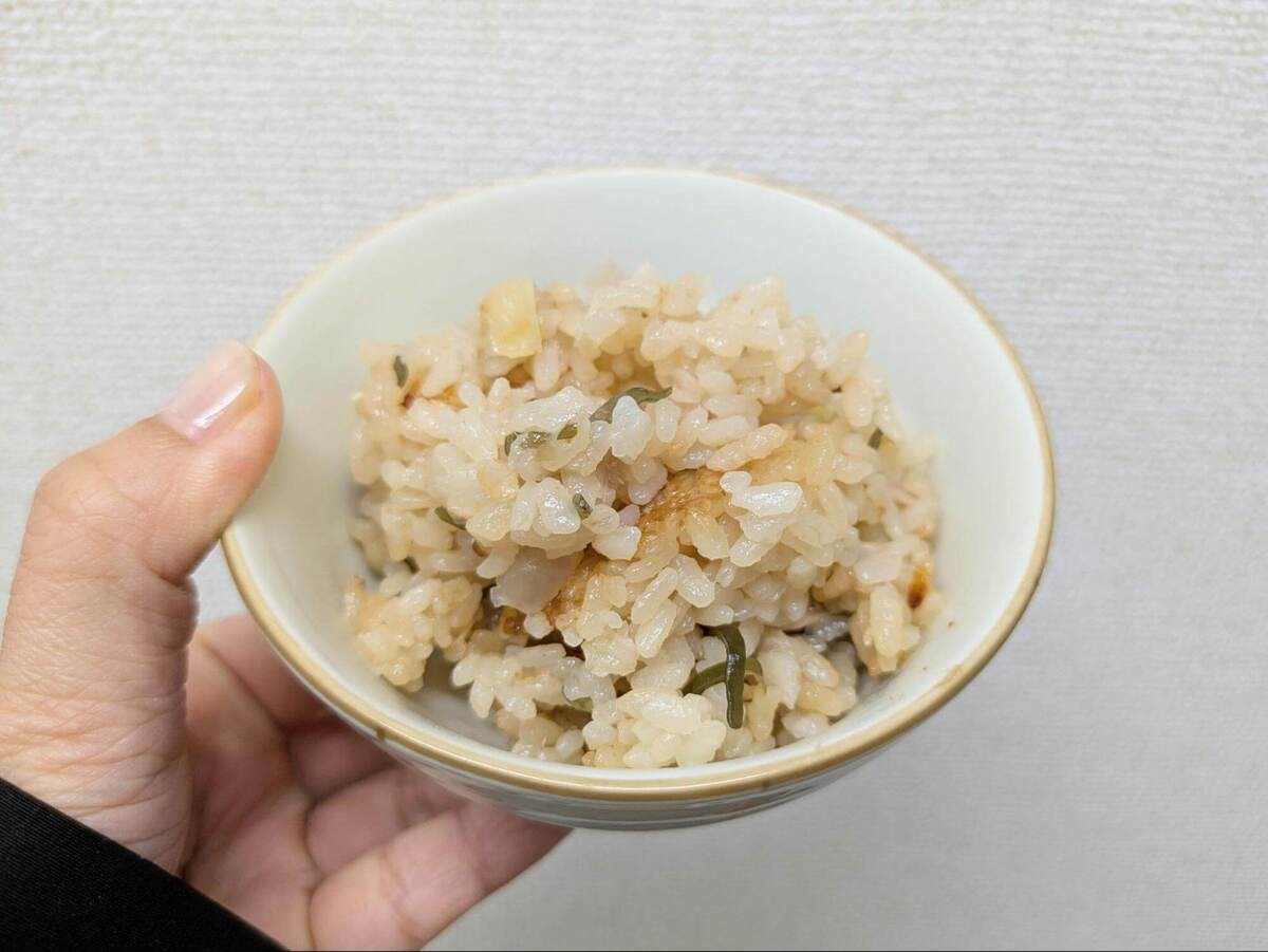 炊き上がった直後の食欲を刺激する香りから想像したとおりのおいしさでした。ツナ缶と塩昆布の相性が抜群で、あと引く味!おこげのしょう油の香ばしさで、お箸が止まりません。