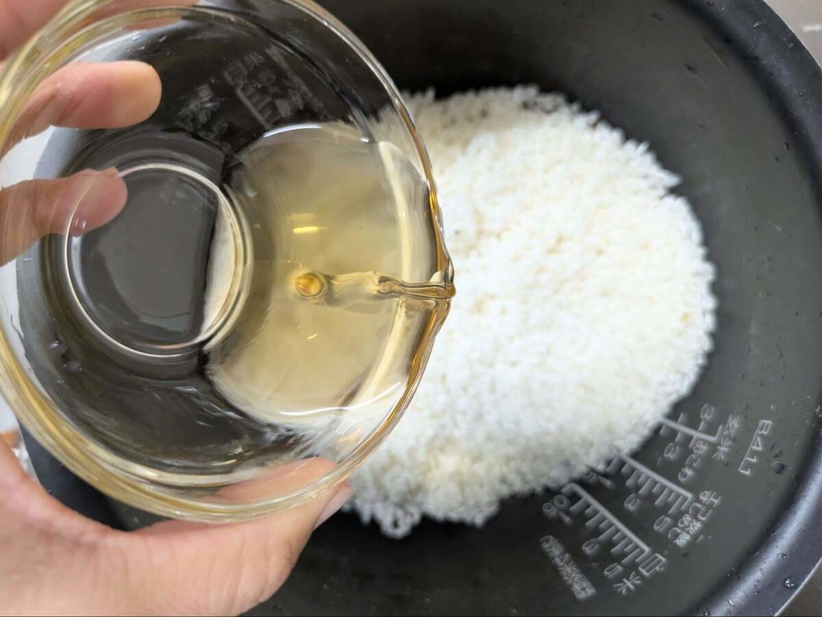 洗った米を炊飯釜に入れ、【A】の調味料を加えます。