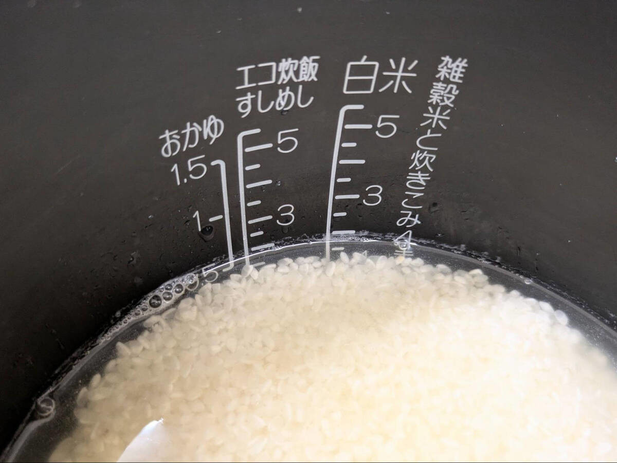 水は2合の目盛りよりほんの少し少なめに入れましょう。調味料が全体に行き渡るように軽くかき混ぜます。