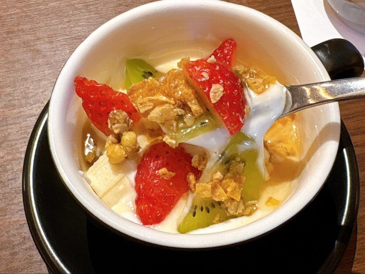 あと少しだけ食べたいなと思い、フルーツヨーグルトを追加注文しました。いちご・バナナ・キウイに、グラノーラまでのった見た目は想像以上に豪華。