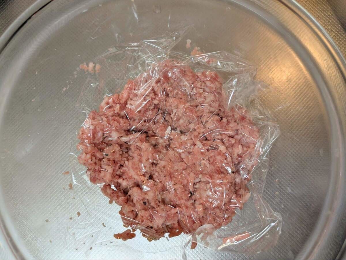 合いびき肉と調味料がよく混ざったら、落としラップして冷蔵庫へ。10~15分おいて味を馴染ませます。