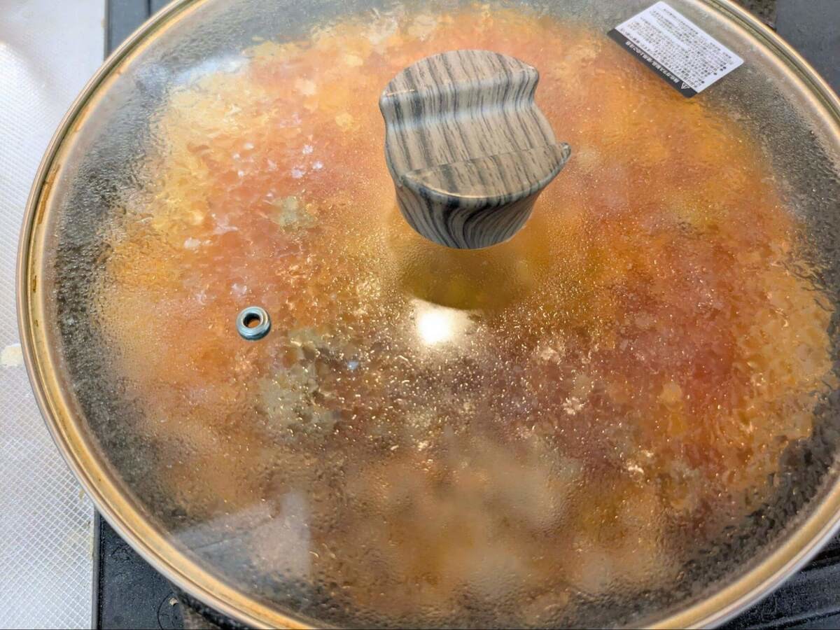 スパゲティがソースに沈んだらフタをし、火を中火に戻して表示時間のとおりに煮ます。